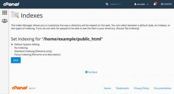 Use the Indexes interface to define how your website displays a specific directory’s index to all visitors