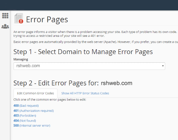 If this account manages more than one domain, select the domain for which you wish to edit an error page from the Managing: menu